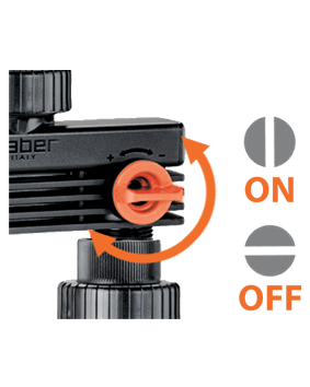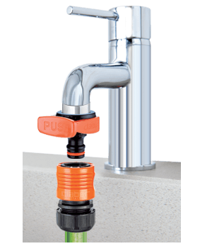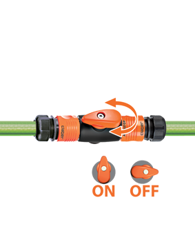 Priključek za cev z zapornim ventilom za odpiranje/zapiranje in regulacijo pretoka vode. Enostavno upravljanje. "Quick-Click®" spajanje s hitrimi spojkami.