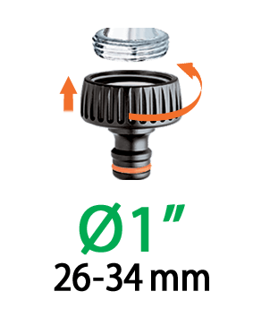Za "Quick-Click®" povezavo hitre spojke na pipo z moškim navojem. Priključek za pipo ima 1" (26-34 mm) ženski navoj in reducirko s 3/4" (20-27 mm) ženskim navojem. Enostavna namestitev na pipo in popolno tesnjenje. Vključuje tesnilo.
