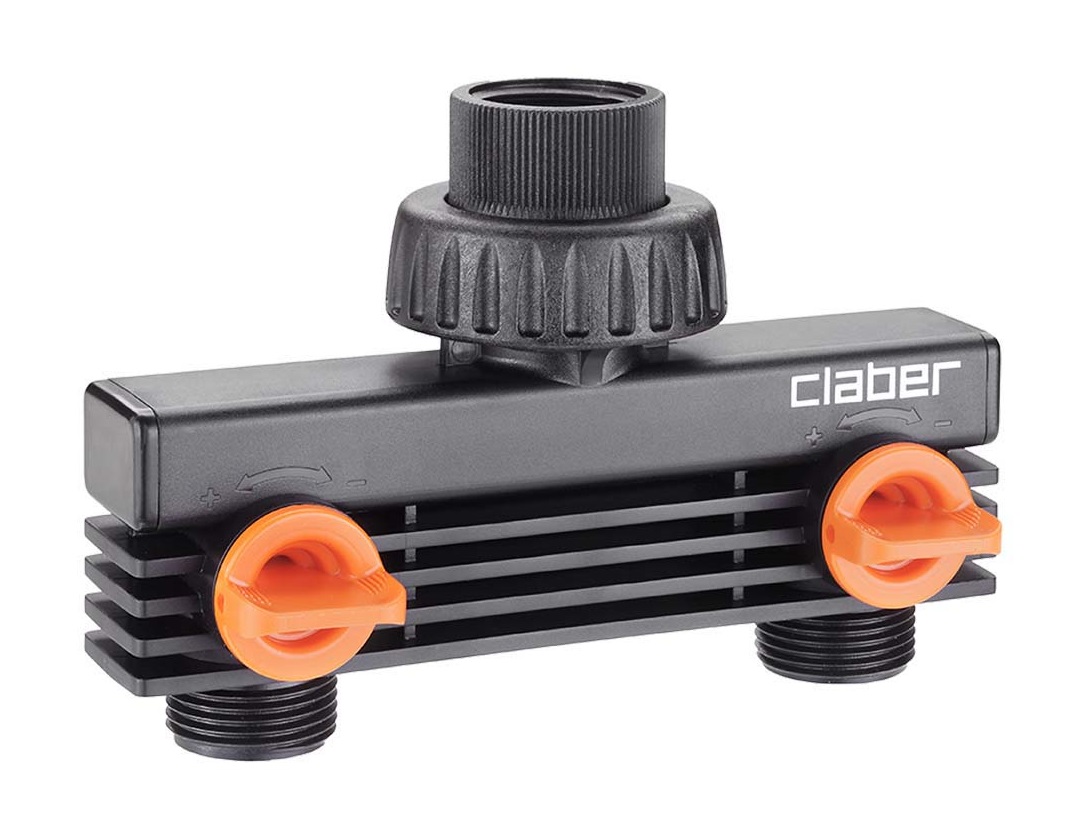 En priključek za povezavo dveh baterijskih krmilnih ur ali drugih naprav na 3/4" pipo. Neodvisni ventil za regulacijo pretoka na vsaki liniji. Montaža brez uporabe orodja. Zagotavlja stabilno povezavo brez puščanja. Ergonomska oblika omogoča enostavno in priročno uporabo tudi z mokrimi rokami.