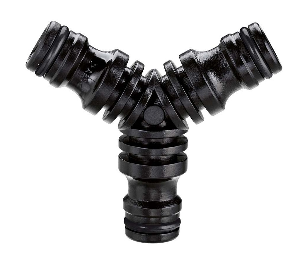 Združi tri cevi na klik in jih tako pretvori eno namakalno linijo v dve ločeni. Montaža brez uporabe orodja. Na vsak konec cevi namestite hitro spojko in med spojke vstavite trojni priključek za cev. Zagotavlja stabilno povezavo brez puščanja.