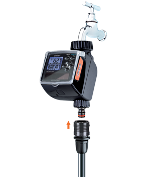 Ena krmilna ura s širokim izborom vnaprej določenih namakalnih časov, s katerimi izjemno preprosto upravljate dve neodvisni vodni liniji, saj uporabljate le nekaj gumbov. Električne povezave niso potrebne: ena 9V beterija zadostuje za celo sezono. Krmilno uro samo privijete na pipo in je že pripravljena za uporabo. Izbirate lahko med 14 namakalnimi časi in 7 frekvencami, kar predstavlja skupno 98 programov za vsako linijo. Osvetljeni LCD zaslon in funkcija zakasnitve izbranega programa. Preizkušena za zanesljivo in brezskrbno delovanje.Že opremljena za enostavno povezavo s senzorjem za dež prek kabla; senzor v primeru dežja prekine program v teku in ga znova zažene, ko dež poneha.