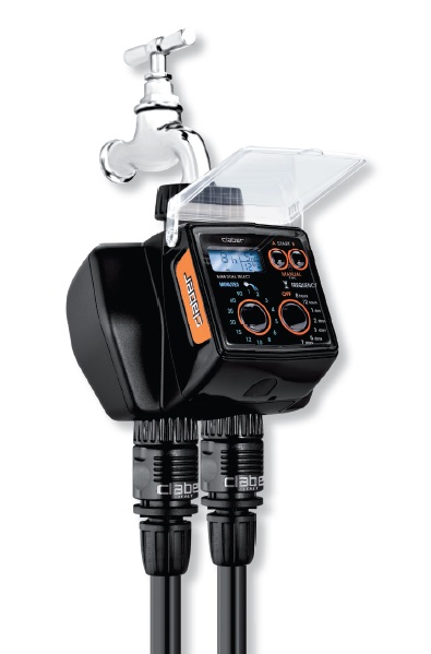 Ena krmilna ura s širokim izborom vnaprej določenih namakalnih časov, s katerimi izjemno preprosto upravljate dve neodvisni vodni liniji, saj uporabljate le nekaj gumbov. Električne povezave niso potrebne: ena 9V beterija zadostuje za celo sezono. Krmilno uro samo privijete na pipo in je že pripravljena za uporabo. Izbirate lahko med 19 prednastavljenimi programi, ki zadovoljujejo vse najpogostejše potrebe po namakanju. Osvetljeni LCD zaslon in funkcija zakasnitve izbranega programa. Preizkušena za zanesljivo in brezskrbno delovanje.Že opremljena za enostavno povezavo s senzorjem za dež prek kabla; senzor v primeru dežja prekine program v teku in ga znova zažene, ko dež poneha.