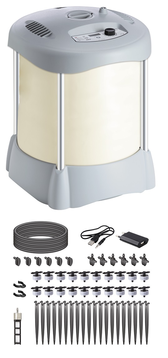 Distributer vode z vgrajeno krmilno uro in črpalko omogoča ustvarjanje lastnega kapljičnega sistema za do 20 lončnic. Primeren je tako za sobne rastline kot tudi za rastline na terasah in balkonih. Sistem se lahko napaja prek električnega omrežja s priloženim USB adapterjem ali prek dveh akumulatorskih AA 1,2V NiMH baterij, min. 2000 mAh (nista priloženi). Zložljiv rezervoar za vodo je izdelan iz debele PVC plastike in ima prostornino 30 litrov. Polnjenje je omogočeno skozi priročno odprtino na vrhu. Za sestavljanje ogrodja ne potrebujete nobenega orodja.