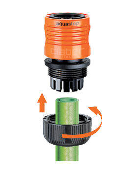 Hitra spojka za 3/4" vrtne cevi (not. Ø 19 mm - zun. Ø 25 mm) z ventilom aquastop. Namesti se na koncu cevi, da prepreči izlivanje vode po končani uporabi.