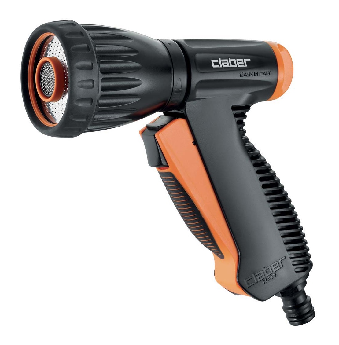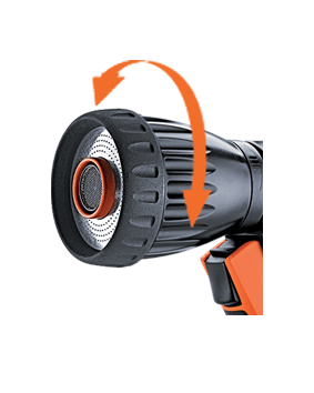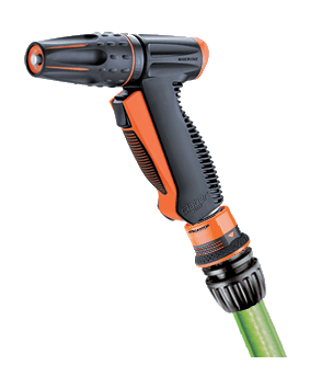 Večnamenska razpršilna pištola z novim anatomsko oblikovanim gumijastim ročajem in priročnim gumbom za vklop/izklop na sprednji strani. Gumb na zadnji strani uravnava moč vodnega curka. Naprava za uporabo načina pršenja je prevlečena z gumo za zaščito pred udarci, poleg tega pa omogoča lažje odpiranje, pregled in čiščenje pištole. Z vrtenjem glave razpršilne pištole lahko izbirate med štirimi različnimi tipi pršenja: tuš, koncentriran curek, nežno škropljenje ali učinek megle.