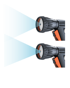 Preprosto zavrtite mehko, z gumo prevlečeno, glavo pištole in že izbirate med 4 vrstami vodnega curka. Tudi ročaj je prevlečen z gumo za popoln oprijem v vseh pogojih. Sprednji del ročaja je gumb, ki omogoča odpiranje ali zapiranje vode z uporabo le enega prsta. Tudi pretok vode lahko nastavite z le eno roko.