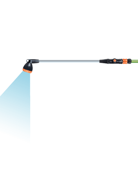 Fino, mehko in nežno pršenje. Nedrseč ročaj z ventilom za reguliranje vodnega toka. Perforiran disk iz nerjavečega jekla. Z dolgim aluminijastim podaljškom.