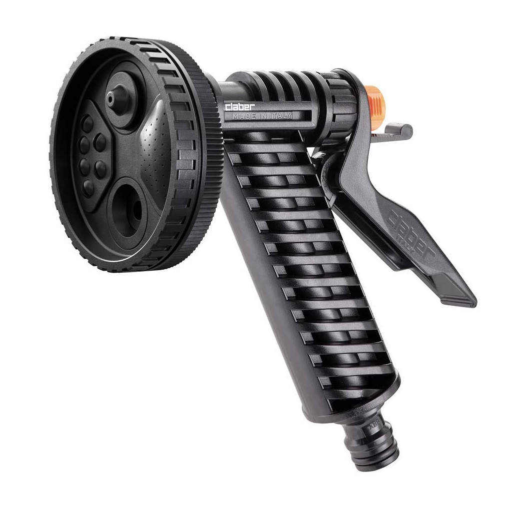 Večnamenska razpršilna pištola s praktičnim ergonomsko oblikovanim ročajem. Obračanje glave pištole omogoča različne načine pršenja: od jeta do nežnega pršenja - nežna ploha - učinek rahlega dežja - škropljenje (curek zmešan z zračnimi mehurčki). Zelo uporabno za zalivanje lončnic. Z ročico za prilagoditev vodnega curka in patentiranim zatičem za uporabo izbranega načina pršenja.