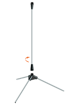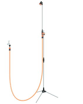 Razstavljen tuš na podaljšku je primeren za vrt, kampiranje in balkone. Osnova je iz nerjavečega aluminija. Tuš ima posebno ročico, s katero se prilagaja višina, in ventil, ki regulira pretok vode. Trinožno stojalo je primerno za vse trde površine. Višina 200 cm.