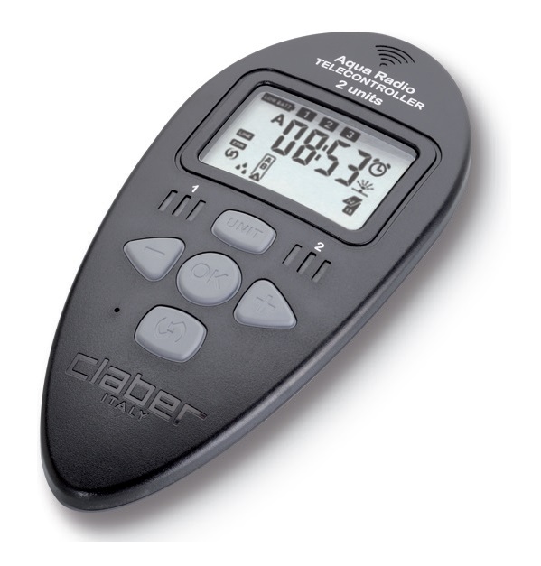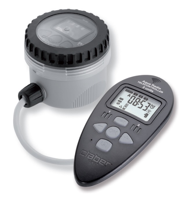 RF daljinski upravljalnik lahko krmili do 2 kontrolni enoti. Ima 5 gumbov za enostavno programiranje. Vse potrebne informacije so jasno prikazane na velikem zaslonu z uporabo številk in simbolov. Za vsako enoto lahko nastavite do 2 dnevna programa s 4 začetki na dan. Omogočeno je tedensko programiranje, kjer lahko določene dneve tudi izpustite. Nastavljen program za vsako enoto posebej lahko kadarkoli pogledate in po potrebi izbrišete. RF daljinski upravljalnik vključuje tudi indikator stanja baterij za vsako povezano enoto (RF kontrolno enoto ali RF senzor za dež). Deluje na dve 1,5V AAA alkalni bateriji, ki zadostujeta za celotno sezono.