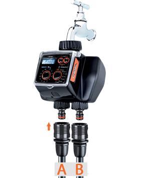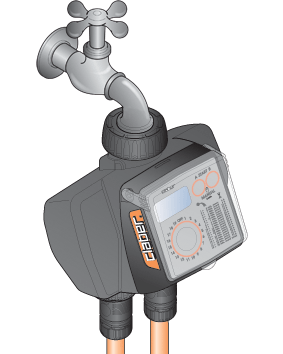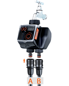 Ena krmilna ura s širokim izborom vnaprej določenih namakalnih časov, s katerimi izjemno preprosto upravljate dve neodvisni vodni liniji, saj uporabljate le nekaj gumbov. Električne povezave niso potrebne: ena 9V beterija zadostuje za celo sezono. Krmilno uro samo privijete na pipo in je že pripravljena za uporabo. Izbirate lahko med 14 namakalnimi časi in 7 frekvencami, kar predstavlja skupno 98 programov za vsako linijo. Osvetljeni LCD zaslon in funkcija zakasnitve izbranega programa. Preizkušena za zanesljivo in brezskrbno delovanje.Že opremljena za enostavno povezavo s senzorjem za dež prek kabla; senzor v primeru dežja prekine program v teku in ga znova zažene, ko dež poneha.