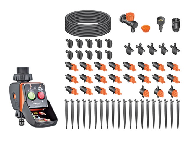 Baterijska krmilna ura s prednastavljimi programi, priključek za pipo, prožna cev, spojke. zmanjševalec pritiska, nastavljivi kapljalniki: vse kar potrebujete za enostavno ustvarjanje lastnega kapljičnega sistema za lončnice, ne da bi za to potrebovali orodje. Količino vode, ki se dovaja k posamezni rastlini, lahko nastavljate. Z obračanjem izbirnika na krmilni uri izbirate med 15 različnimi programi. Idealen set za "naredi si sam" projekte ali kot darilo.