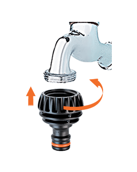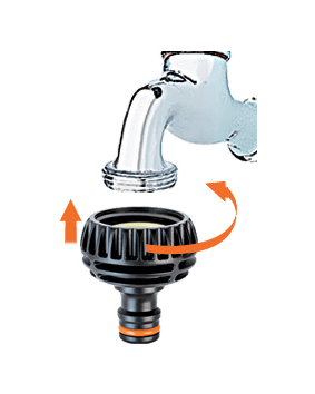 Z enim priključkom za pipo lahko enostavno priključite hitro spojko na pipo s 3/4" ali 1" navojem, brez uporabe orodja. Zagotavlja stabilno povezavo brez puščanja. Njegova ergonomska oblika omogoča enostavno in priročno uporabo tudi z mokrimi rokami.