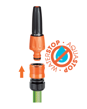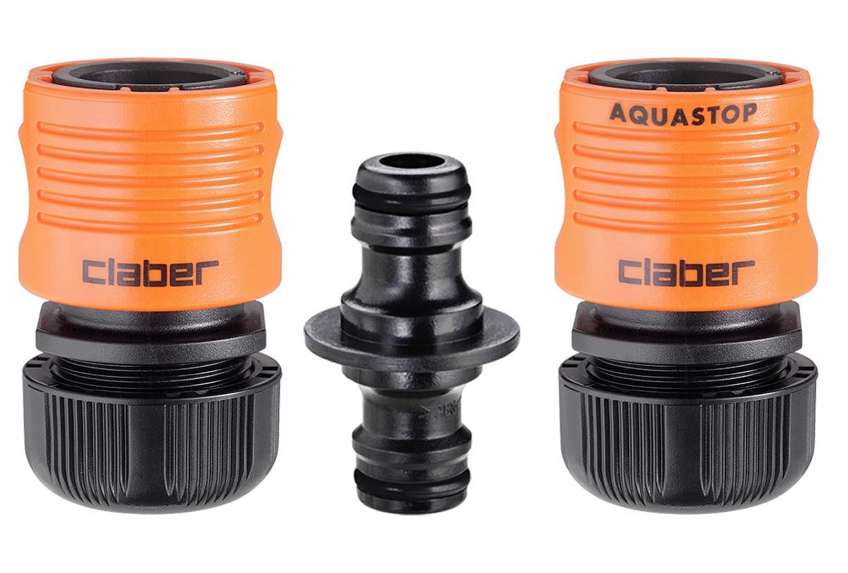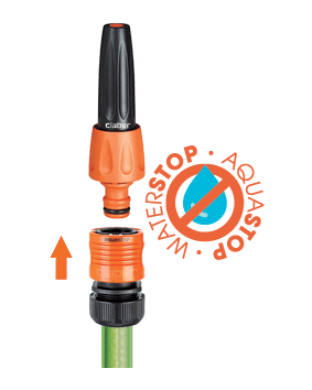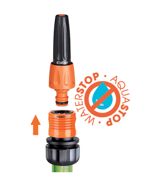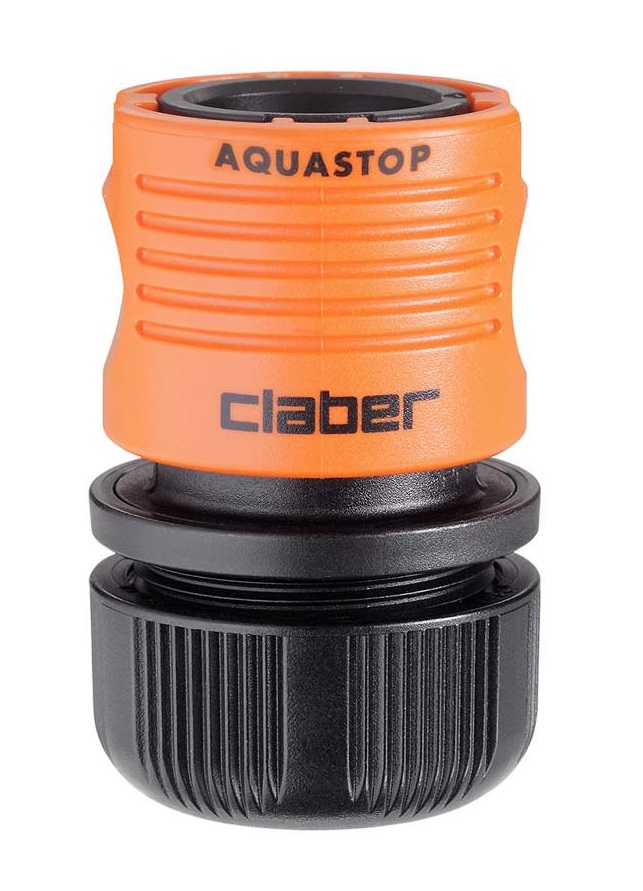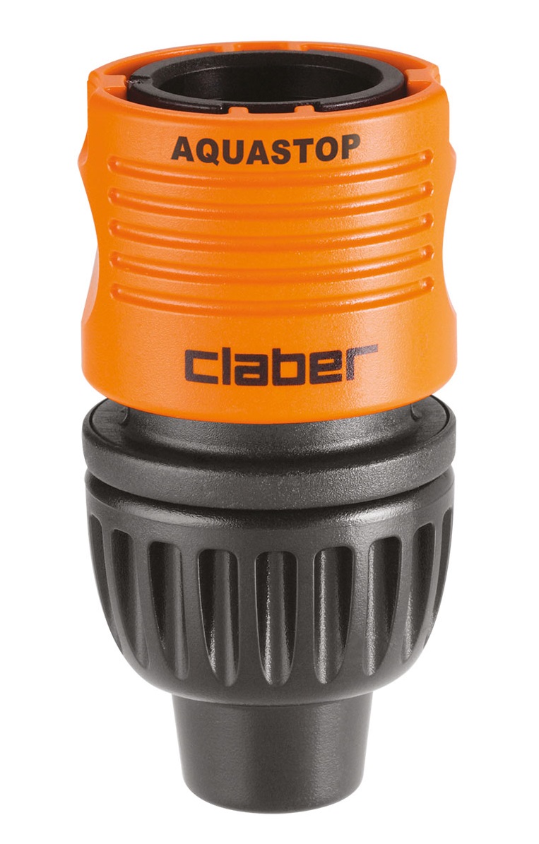 Hitra spojka z avtomatskim zaustavljanjem vode (sistem Aquastop) omogoča spojitev in odstranitev priključkov s konca cevi, ne da bi za to morali zapreti vodo. Izdelek je rezultat Claber® raziskav in izkušenj. Spojka je popolnoma nerjaveča (ne vsebuje kovinskih delov), odporna na udarce, zunanje vplive in UV žarke ter odporna na zelo visoke vodne pritiske: do 40 barov, kar je precej večji pritisk, kot je v običajnih domačih vrtnih napeljavah. Notranja vzmet je patentirana, izjemno odporna in z dolgo življenjsko dobo.