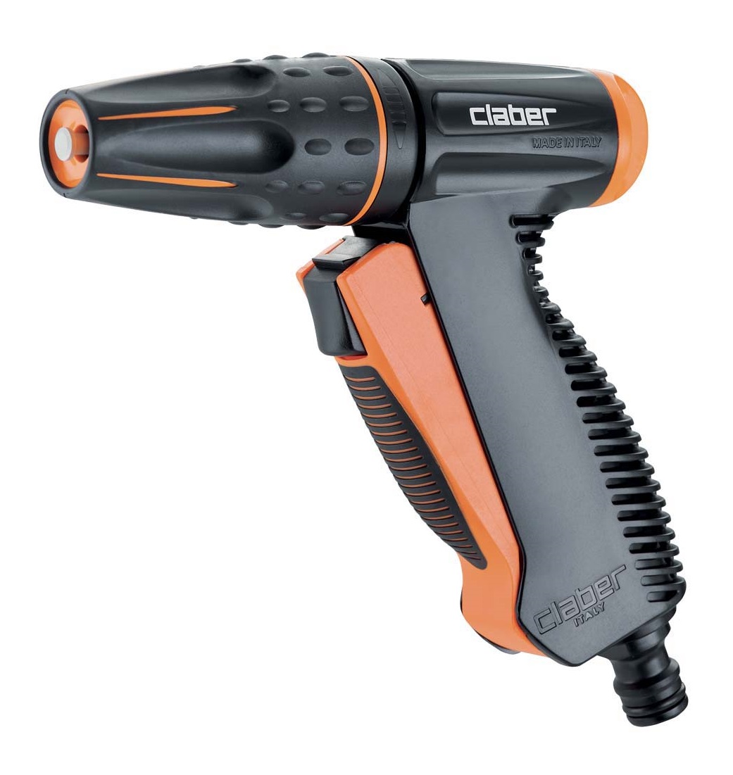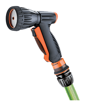Večnamenska razpršilna pištola z novim anatomsko oblikovanim gumijastim ročajem in priročnim gumbom za vklop/izklop na sprednji strani. Gumb na zadnji strani uravnava moč vodnega curka. Naprava za uporabo načina pršenja je prevlečena z gumo za zaščito pred udarci, poleg tega pa omogoča lažje odpiranje, pregled in čiščenje pištole. Z vrtenjem glave razpršilne pištole lahko izbirate med štirimi različnimi tipi pršenja: tuš, koncentriran curek, nežno škropljenje ali učinek megle.