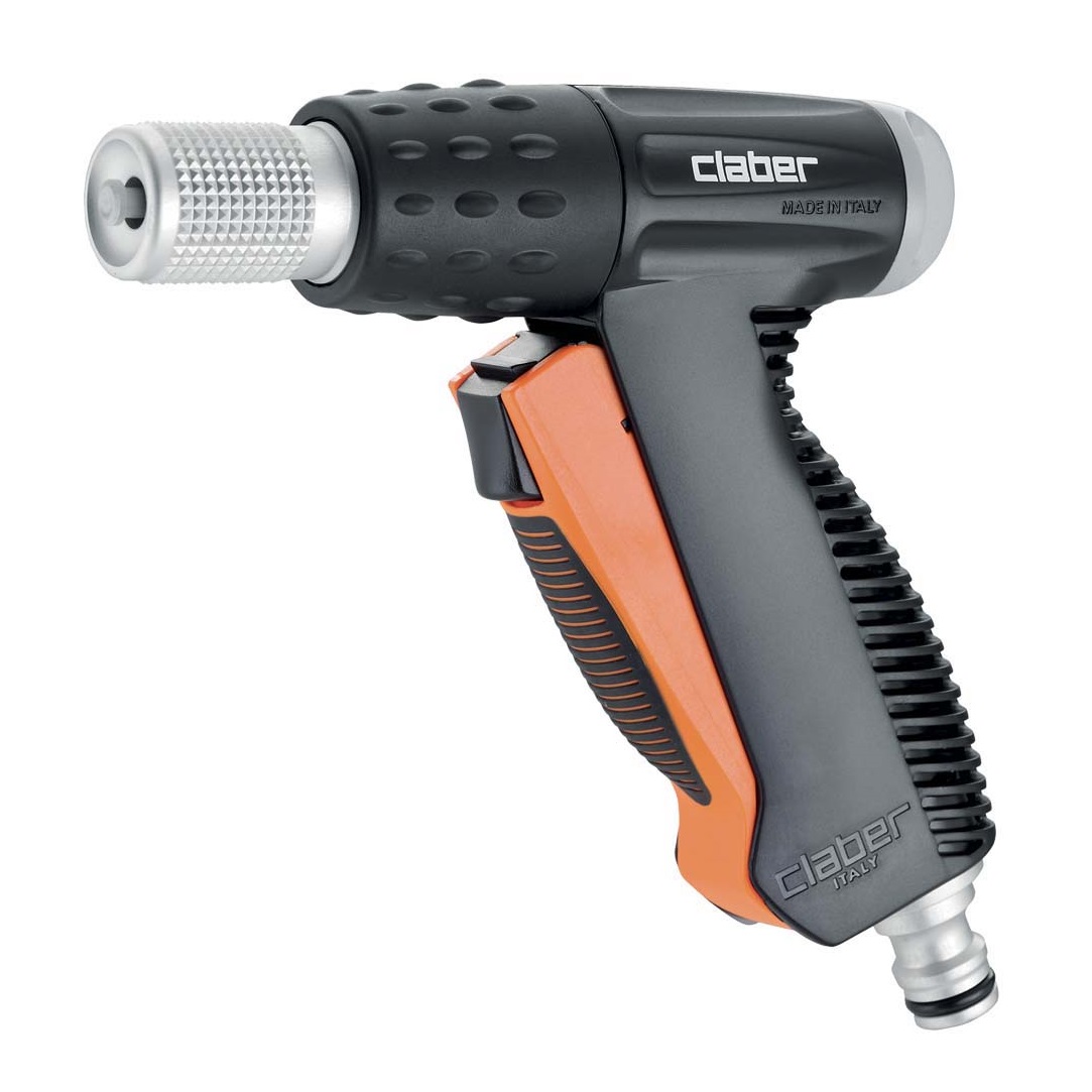 Razpršilna pištola z odpornimi, nespremenljivimi kromiranimi kovinskimi deli, novim anatomsko oblikovanim gumijastim ročajem in priročnim mehanizmom za vklop/izklop na sprednji strani. Kovinski gumb za uravnavanje moči vodnega curka. Glava pištole je obložena z gumo, ki jo ščiti pred udarci. Pretok vode se lahko prilagaja zahtevam, od popolnoma zaprte (koncentiran curek) do popolnoma odprte (pršenje).