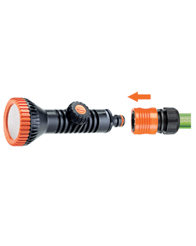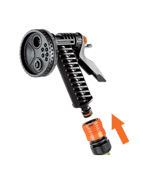 Vse kar potrebujete za učinkovito in udobno zalivanje: edino kar manjka je cev! Vsebuje razpršilno pištolo z ergonomskim ročajem - kompaktna, trdna, enostavna in udobna za uporabo - in mehanizmom s katerim nastavljate vodni curek in zataknete izbrani način zalivanja, kar je zelo koristno, da preprečite utrujenost rok ob daljši uporabi, 3/4" priključek za pipo reducirko na 1/2", ki ga namestite brez uporabe orodja, dve hitri spojki za "Quick-Click®" spajanje, pri čemer je ena klasična, druga pa z ventilom Aquastop, ki vam omogoča hitro povezavo ali odstranitev razpršilca, ne da bi za to morali zapreti vodo.