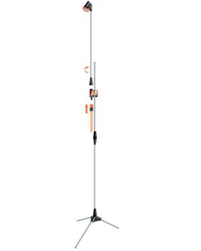 Razstavljen tuš na podaljšku je primeren za vrt, kampiranje in balkone. Osnova je iz nerjavečega aluminija. Tuš ima posebno ročico, s katero se prilagaja višina, in ventil, ki regulira pretok vode. Trinožno stojalo je primerno za vse trde površine. Višina 200 cm.